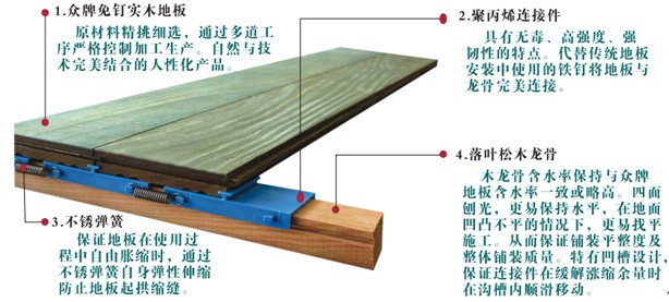 眾牌免釘?shù)匕迨菄覍@a(chǎn)品,全國前30家市場放心品牌,由業(yè)內(nèi)多位知名專家,經(jīng)數(shù)年實(shí)踐、研究而設(shè)計、制造的一種新型組合式實(shí)木地板。眾牌免釘?shù)匕宀捎秒p企口榫結(jié)構(gòu)、標(biāo)準(zhǔn)木龍骨、聚丙烯連接件及不銹鋼彈簧組成,在保證傳統(tǒng)實(shí)木地板優(yōu)點(diǎn)的前提下,完美無損傷安裝。 在傳統(tǒng)的實(shí)木地板安裝過程中,絕大多數(shù)產(chǎn)品均使用鐵釘、膠水等,這樣不僅會使地板本身受到損傷,且一旦鋪裝成型后,拆卸起來非常麻煩,尤其對實(shí)木地板來說,由于木頭本身所獨(dú)有的顏色,極易出現(xiàn)色差情況,如果需要調(diào)整則非常困難。而眾牌免釘?shù)匕鍏s不會出現(xiàn)這樣的情況,眾牌免釘?shù)匕逶阡佈b過程中,不使用釘子、膠水,而使用獲得國家專利技術(shù)的連接件固定,從而避免了對地板的損害,不僅比釘子更牢固,且環(huán)保無毒。另外眾牌免釘?shù)匕宀鹧b起來非常方便,搬家或者更換地板顏色都非常方便,使地板可以循環(huán)使用,保護(hù)自然資源。