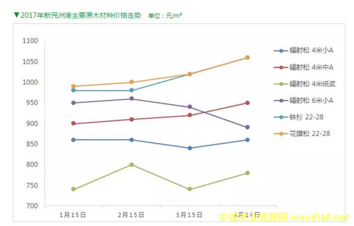 2017年新民洲港輻射松原木、鐵杉、花旗松價(jià)格走勢圖